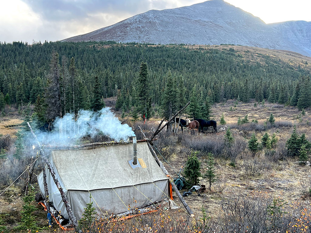 At times, we “spike camp” out from the primary back country camps. These spike camps will consist of a wall tent or dome tent depending on the season and are serviced by horseback only. On later hunts a collapsible stove will be added to the wall tent to provide a more comfortable experience for sleeping, eating and drying out gear. You will be sleeping on the floor of the tents on a foam and air mattress bedroll, not the 4 seasons but comfortable nonetheless. Meals will be similar to the primary back country camps with a bit of freeze dried food added to help the horses out and to be as efficient as possible.